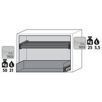 Stockage sécurisé, conforme à la réglementation en vigueur des produits dangereux, inflammables dans les zones de travail Fonction / Construction : Robuste et durable : stucture extérieure en acier revêtu époxy Confort de travail : immobilisation des tiroirs dans toutes les positions, accès vertical à tous les récipients, fermeture automatique en cas d'incendie Sûr : tiroir avec câble de mise à la terre, borne, bac étanche soudé, tiroir à fermeture automatique en cas d'incendie Utilisation controlée : tiroir verrouillable avec serrure intégrée, et indicateur de verrouillage des portes (rouge/vert) Mobile : socle avec roulettes en option, pour un déplacement facile de l'armoire Aération et ventilation : système d'aération et de ventilation intégrés pour le raccordement (NW 50) à un dispositif technique d'évacuation d'air Fabriqué en Allemagne