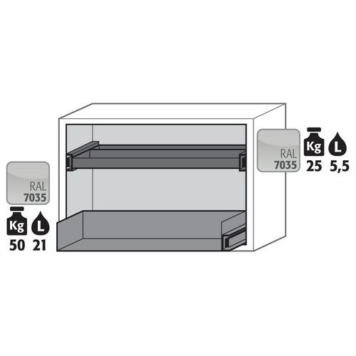 Stockage sécurisé, conforme à la réglementation en vigueur des produits dangereux, inflammables dans les zones de travail Fonction / Construction : Robuste et durable : stucture extérieure en acier revêtu époxy Confort de travail : immobilisation des tiroirs dans toutes les positions, accès vertical à tous les récipients, fermeture automatique en cas d'incendie Sûr : tiroir avec câble de mise à la terre, borne, bac étanche soudé, tiroir à fermeture automatique en cas d'incendie Utilisation controlée : tiroir verrouillable avec serrure intégrée, et indicateur de verrouillage des portes (rouge/vert) Mobile : socle avec roulettes en option, pour un déplacement facile de l'armoire Aération et ventilation : système d'aération et de ventilation intégrés pour le raccordement (NW 50) à un dispositif technique d'évacuation d'air