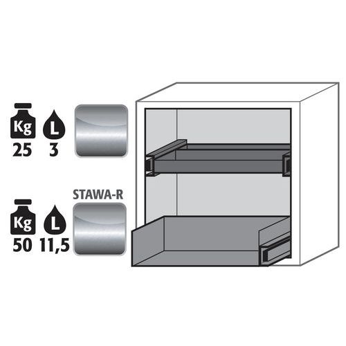 Stockage sécurisé, conforme à la réglementation en vigueur des produits dangereux, inflammables dans les zones de travail Fonction / Construction : Robuste et durable : stucture extérieure en acier revêtu époxy Confort de travail : immobilisation des tiroirs dans toutes les positions, accès vertical à tous les récipients, fermeture automatique en cas d'incendie Sûr : tiroir avec câble de mise à la terre, borne, bac étanche soudé, tiroir à fermeture automatique en cas d'incendie Utilisation controlée : tiroir verrouillable avec serrure intégrée, et indicateur de verrouillage des portes (rouge/vert) Mobile : socle avec roulettes en option, pour un déplacement facile de l'armoire Aération et ventilation : système d'aération et de ventilation intégrés pour le raccordement (NW 50) à un dispositif technique d'évacuation d'air
