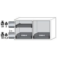 Stockage sécurisé, conforme à la réglementation en vigueur des produits dangereux, inflammables dans les zones de travail Fonction / Construction : Robuste et durable : stucture extérieure en acier revêtu époxy Confort de travail : immobilisation des tiroirs dans toutes les positions, accès vertical à tous les récipients, fermeture automatique en cas d'incendie Sûr : tiroirs avec câble de mise à la terre, borne, bac étanche soudé Utilisation controlée : tiroirs verrouillables avec serrure intégrée, et indicateur de verrouillage des portes (rouge/vert) Mobile : socle avec roulettes en option, pour un déplacement facile de l'armoire Aération et ventilation : système d'aération et de ventilation intégrés pour le raccordement (NW 50) à un dispositif technique d'évacuation d'air Fabriqué en Allemagne
