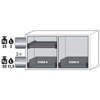 Stockage sécurisé, conforme à la réglementation en vigueur des produits dangereux, inflammables dans les zones de travail Fonction / Construction : Robuste et durable : stucture extérieure en acier revêtu époxy Confort de travail : immobilisation des tiroirs dans toutes les positions, accès vertical à tous les récipients, fermeture automatique en cas d'incendie Sûr : tiroirs avec câble de mise à la terre, borne, bac étanche soudé Utilisation controlée : tiroirs verrouillables avec serrure intégrée, et indicateur de verrouillage des portes (rouge/vert) Mobile : socle avec roulettes en option, pour un déplacement facile de l'armoire Aération et ventilation : système d'aération et de ventilation intégrés pour le raccordement (NW 50) à un dispositif technique d'évacuation d'air Fabriqué en Allemagne