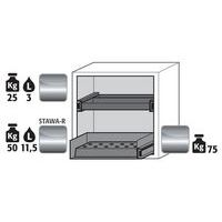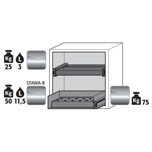 Stockage sécurisé, conforme à la réglementation en vigueur des produits dangereux, inflammables dans les zones de travail Fonction / Construction : Robuste et durable : stucture extérieure en acier revêtu époxy Confort de travail : immobilisation des tiroirs dans toutes les positions, accès vertical à tous les récipients, fermeture automatique en cas d'incendie Sûr : tiroir avec câble de mise à la terre, borne, bac étanche soudé, tiroir à fermeture automatique en cas d'incendie Utilisation controlée : tiroir verrouillable avec serrure intégrée, et indicateur de verrouillage des portes (rouge/vert) Mobile : socle avec roulettes en option, pour un déplacement facile de l'armoire Aération et ventilation : système d'aération et de ventilation intégrés pour le raccordement (NW 50) à un dispositif technique d'évacuation d'air