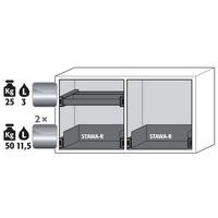 Stockage sécurisé, conforme à la réglementation en vigueur des produits dangereux, inflammables dans les zones de travail Fonction / Construction : Robuste et durable : stucture extérieure en acier revêtu époxy Confort de travail : immobilisation des tiroirs dans toutes les positions, accès vertical à tous les récipients, fermeture automatique en cas d'incendie Sûr : tiroirs avec câble de mise à la terre, borne, bac étanche soudé Utilisation controlée : tiroirs verrouillables avec serrure intégrée, et indicateur de verrouillage des portes (rouge/vert) Mobile : socle avec roulettes en option, pour un déplacement facile de l'armoire Aération et ventilation : système d'aération et de ventilation intégrés pour le raccordement (NW 50) à un dispositif technique d'évacuation d'air Fabriqué en Allemagne