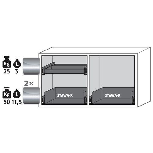 Stockage sécurisé, conforme à la réglementation en vigueur des produits dangereux, inflammables dans les zones de travail Fonction / Construction : Robuste et durable : stucture extérieure en acier revêtu époxy Confort de travail : immobilisation des tiroirs dans toutes les positions, accès vertical à tous les récipients, fermeture automatique en cas d'incendie Sûr : tiroirs avec câble de mise à la terre, borne, bac étanche soudé Utilisation controlée : tiroirs verrouillables avec serrure intégrée, et indicateur de verrouillage des portes (rouge/vert) Mobile : socle avec roulettes en option, pour un déplacement facile de l'armoire Aération et ventilation : système d'aération et de ventilation intégrés pour le raccordement (NW 50) à un dispositif technique d'évacuation d'air