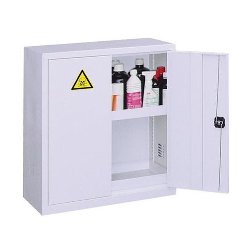 Conforme à la réglementation en vigueur. Construction en acier 8/10ème. Orifices de ventilation supplémentaire. Fermeture à clé pour plus de sécurité. Ne convient pas au stockage de produits inflammables en laboratoire. Rez-de-chaussée livraison au pied de l'immeuble. Pour toutes demandes particulières de livraison, veuillez contacter notre Service Clients (installation, mètre de roulage supplémentaire). Charge maxi (kg) : 60 kg
