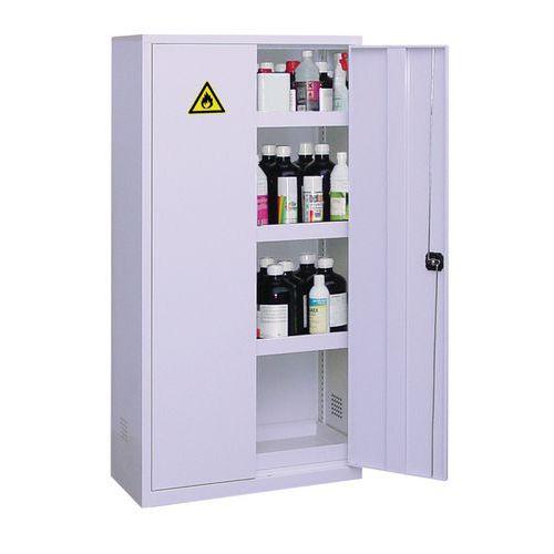 Conforme à la réglementation en vigueur. Construction en acier 8/10ème. Orifices de ventilation supplémentaire. Fermeture à clé pour plus de sécurité. Ne convient pas au stockage de produits inflammables en laboratoire. Rez-de-chaussée livraison au pied de l'immeuble. Pour toutes demandes particulières de livraison, veuillez contacter notre Service Clients (installation, mètre de roulage supplémentaire). Charge maxi (kg) : 60