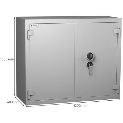 | Intitulé du produit | Armoire forte antifeu, Hauteur hors tout: 1000 mm, Largeur hors tout: 1200 mm, Type de fermeture: À code |