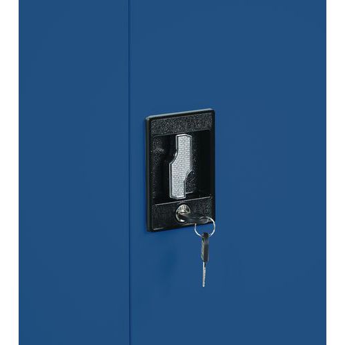 Armoire haute monobloc avec portes battantes. Avec des étagères supportant une charge de 40 kg, adaptées au stockage général. Revêtement de protection avec une finition résistante et facile à nettoyer. La serrure cylindrique intégrée est fournie avec deux clés. Fabriquée en acier soudé pour plus de durabilité. Cadre gris clair RAL 7035 avec une finition époxy. Portes bleues RAL 5009. Des instructions de montage complètes sont incluses dans ce kit plat. Garantie client : 10 ans Montage : À monter Charge maxi par tablette (kg) : 40 kg