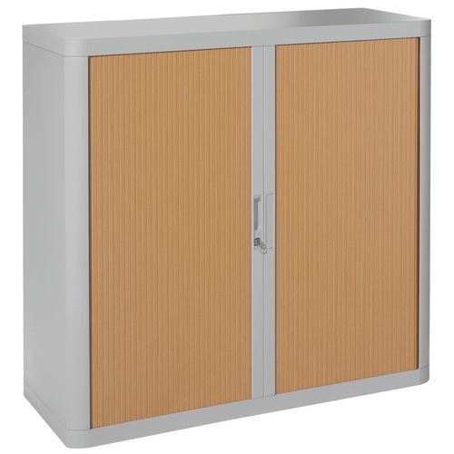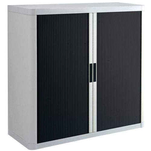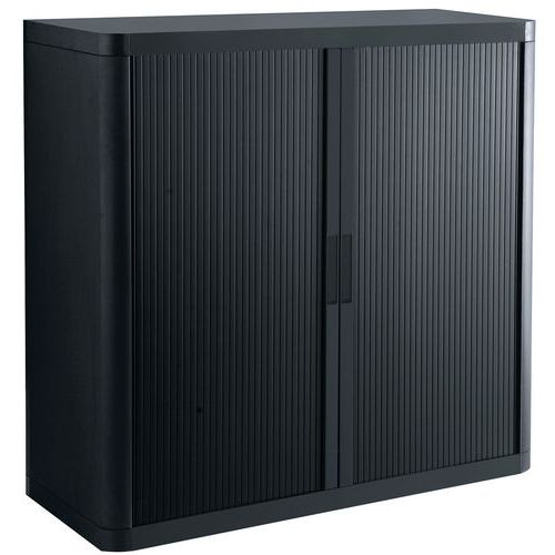 Armoire de bureau Easy Office hauteur 104 cm, solide. Angles arrondis et dessus de finition laqué. Poignée encastrée avec cache de finition. Structure interne et tablette en acier. Serrure à double sortie livrée avec 1 jeu de 2 clés. Tablettes métal coloris noir équipées pour dossiers suspendus. Réglables tous les 8 cm. Charge utile : 75 kg répartis. Rideau polypropylène s'escamotant totalement sur les côtés pour accessibilité maximum de l'armoire. Livrées à plat avec notice de montage.