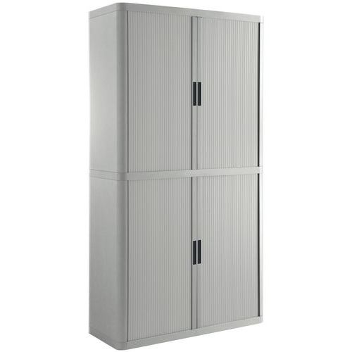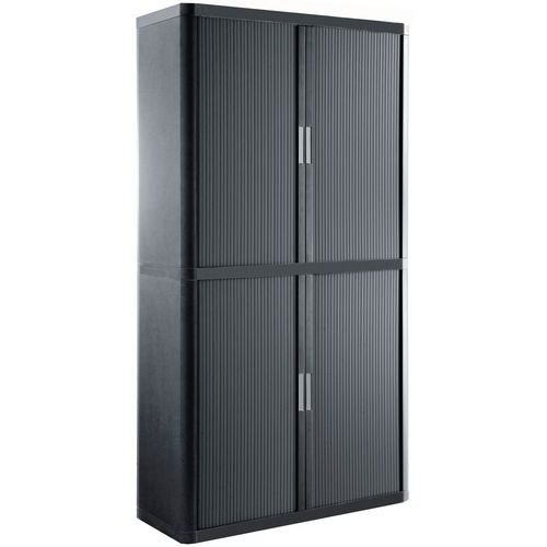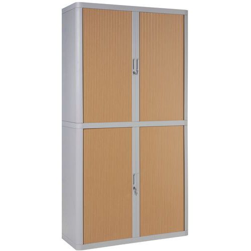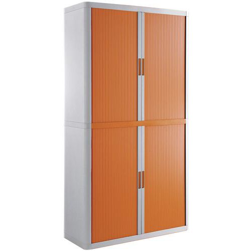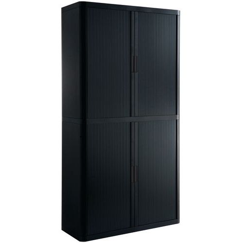 Armoire de bureau Easy Office hauteur 204 cm, solide. Angles arrondis et dessus de finition laqué. Poignée encastrée avec cache de finition. Structure interne et tablette en acier. Serrure à double sortie livrée avec 1 jeu de 2 clés. Tablettes métal coloris noir équipées pour dossiers suspendus. Réglables tous les 8 cm. Charge utile : 75 kg répartis. Rideau polypropylène s'escamotant totalement sur les côtés pour accessibilité maximum de l'armoire. Livrées à plat avec notice de montage.