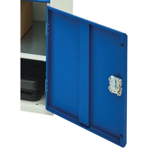 Fermeture par crémone 3 points (double portes en largeur 800 et 1050 mm, simple porte en largeur 525 mm) Tablettes en acier galvanisé réglables au pas de 25 mm, charge de 60 Kg 350mm profondeur