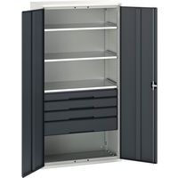 Construction en tôle d’acier avec portes renforcées Tablettes en acier galvanisé réglables au pas de 25mm Charge par tablette et tiroir 60 Kg Tiroirs intérieurs montés sur roulements Profondeur 550 mm Conseils de sécurité : - installer le meuble sur une surface plane - le fixer sur un mur ou une cloison avec une fixation adaptée - veiller à ne pas dépasser la charge maximum conseillée, ainsi qu’à sa bonne répartition Fabriqué au RU Charge maxi par tablette (kg) : 75 kg Charge maxi (kg) : 1000 kg