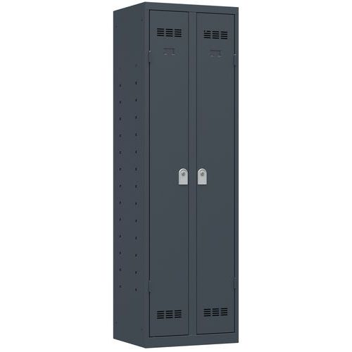 Vestiaire multiservices 2 portes. Composé d'une partie penderie et d'une partie rangement. Gamme moderne alliant qualité, sécurité et design. Soudés en usine, pour une robustesse optimale. Niveau très élevé de résistance à l'effraction. Conseils de sécurité : - installer le meuble sur une surface plane - le fixer sur un mur ou une cloison avec une fixation adaptée - veiller à ne pas dépasser la charge maximum conseillée, ainsi qu’à sa bonne répartition
