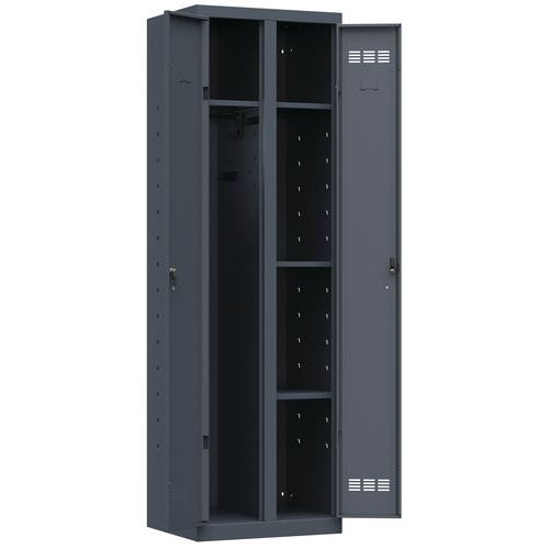 Vestiaire multiservices 2 portes. Composé d'une partie penderie et d'une partie rangement. Gamme moderne alliant qualité, sécurité et design. Soudés en usine, pour une robustesse optimale. Niveau très élevé de résistance à l'effraction. Conseils de sécurité : - installer le meuble sur une surface plane - le fixer sur un mur ou une cloison avec une fixation adaptée - veiller à ne pas dépasser la charge maximum conseillée, ainsi qu’à sa bonne répartition