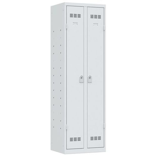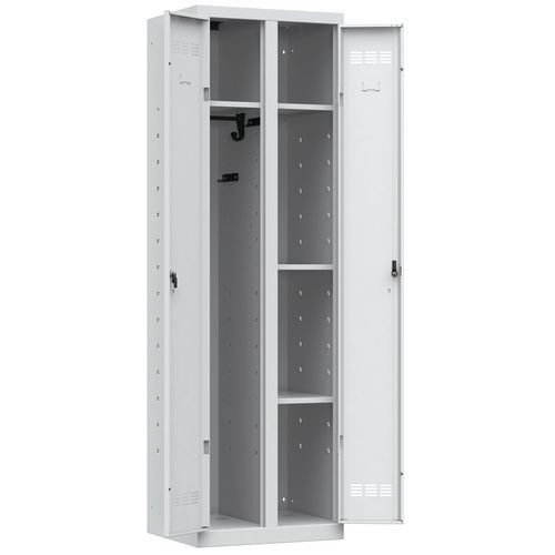 Vestiaire multiservices 2 portes. Composé d'une partie penderie et d'une partie rangement. Gamme moderne alliant qualité, sécurité et design. Soudés en usine, pour une robustesse optimale. Niveau très élevé de résistance à l'effraction. Conseils de sécurité : - installer le meuble sur une surface plane - le fixer sur un mur ou une cloison avec une fixation adaptée - veiller à ne pas dépasser la charge maximum conseillée, ainsi qu’à sa bonne répartition