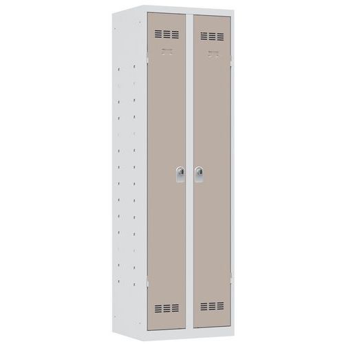 Vestiaire multiservices 2 portes. Composé d'une partie penderie et d'une partie rangement. Gamme moderne alliant qualité, sécurité et design. Soudés en usine, pour une robustesse optimale. Niveau très élevé de résistance à l'effraction. Conseils de sécurité : - installer le meuble sur une surface plane - le fixer sur un mur ou une cloison avec une fixation adaptée - veiller à ne pas dépasser la charge maximum conseillée, ainsi qu’à sa bonne répartition