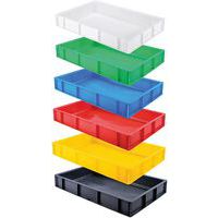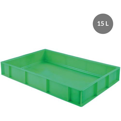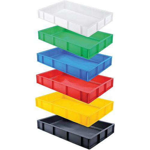 Caisse pleine 600x400. Pour les traiteurs, restaurateurs : caisse de stockage des matières premières. Empilable avec et sans couvercle, grande capacité d'empilement en hauteur. Fond plat sans zone de rétention, nettoyage facile.