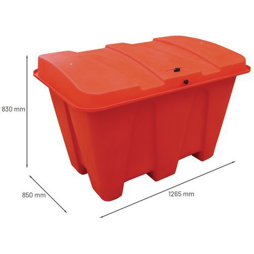 | Intitulé du produit | Bac à sel ou sable 500L, Capacité: 500 L, Longueur: 1265 mm, Profondeur: 850 mm, Ouverture d'écoulement: non |
