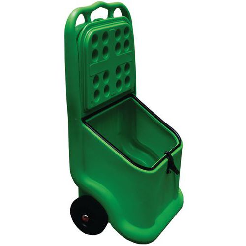 Bac à sel ou à sable de petit format et mobile en polyéthylène. Roues en caoutchouc et poignées de préhension ergonomique. Résiste à la plupart des produits chimiques, s'utilise en intérieur et en extérieur. Ferme avec joints et grenouillère. Poignées de manutention.