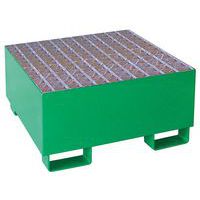Préhension possible sur les 4 côtés. Manutention possible même chargé. Bac étanche contrôlé en usine par ressuage. Primaire antirouille de protection. Les mailles de la plateforme sont de dimensions 65 x 65 mm. Coloris vert RAL 6029.