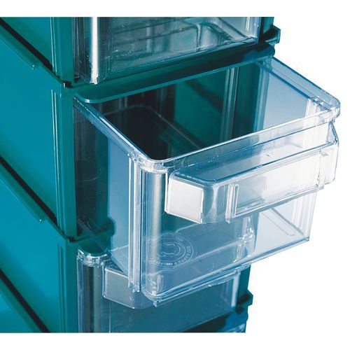 Empilable, assemblable, auto-portant. Bac à tiroirs transparents en plastique. Parois latérales reliables grâce à un système d'accrochage. Cadre supérieur pouvant être fermé par un couvercle.