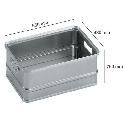 | Intitulé du produit | Bac de transport aluminium, Capacité: 60 L, Hauteur hors tout: 260 mm, Largeur hors tout: 430 mm |