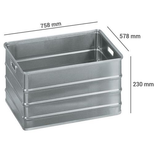 | Intitulé du produit | Bac de transport aluminium, Capacité: 77 L, Hauteur hors tout: 230 mm, Largeur hors tout: 578 mm |