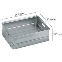 | Intitulé du produit | Bac de transport aluminium, Capacité: 116 L, Hauteur hors tout: 330 mm, Largeur hors tout: 578 mm |
