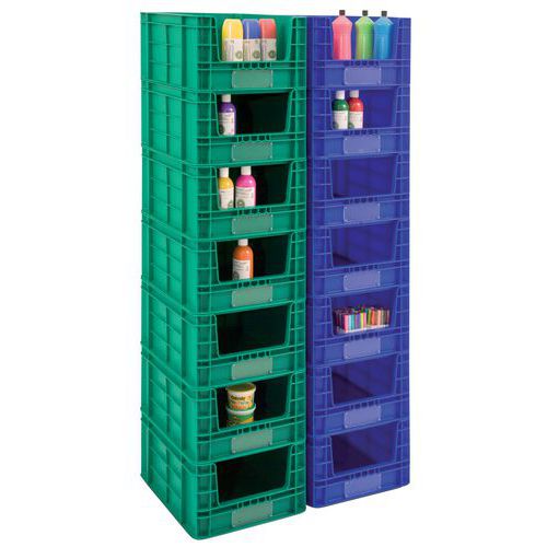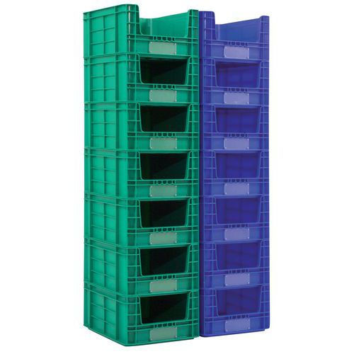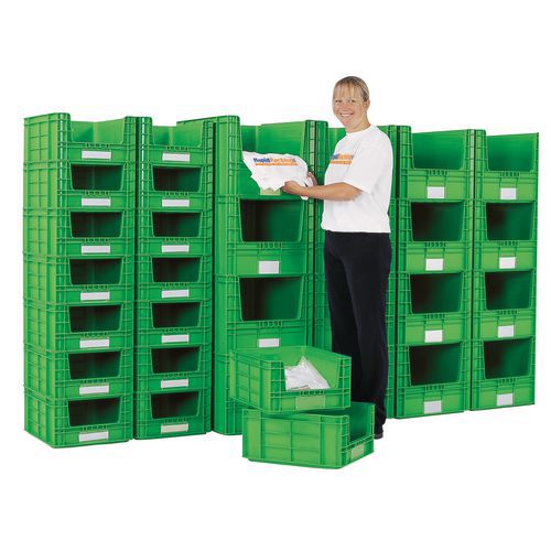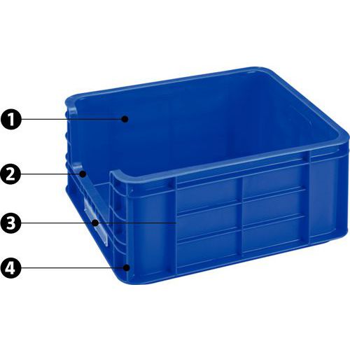Large ouverture pour un accès facile au contenu. Grande résistance via ses nervures de renfort. Bonne stabilité au gerbage. Identification facile par porte-étiquette. Bac gerbable à parois lisses : nettoyage facile assuré.