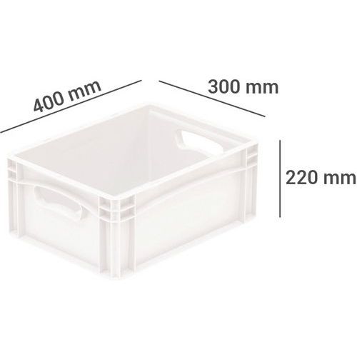 | Intitulé du produit | Bac gerbable plein blanc, Capacité: 20.8 L, Hauteur hors tout: 220 mm, Largeur hors tout: 300 mm |