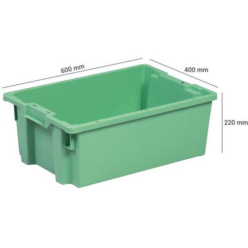 Gerbable ou emboîtable par simple retournement grâce à sa structure asymétrique. Gain de place à l’emboîtement de 65%. Fond plat pour compatibilité avec convoyeurs automatiques. Bac gerbable compatible alimentaire. Disponible en 5 modèles. Charge maxi (kg) : 25 kg Usage alimentaire