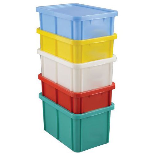 Bac avec couvercle et cartouche d’identification du contenu. Facilitent l’intégration d’une démarche HACCP. Gerbables avec ou sans couvercle. PEHD.