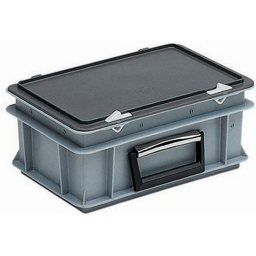 Mallette plastique avec poignée transport sur long côté.