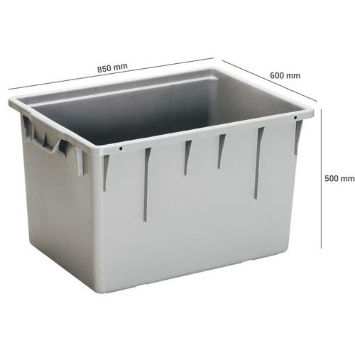 | Intitulé du produit | Bac navette gerbable, Capacité: 180 L, Hauteur hors tout: 500 mm, Largeur hors tout: 600 mm |