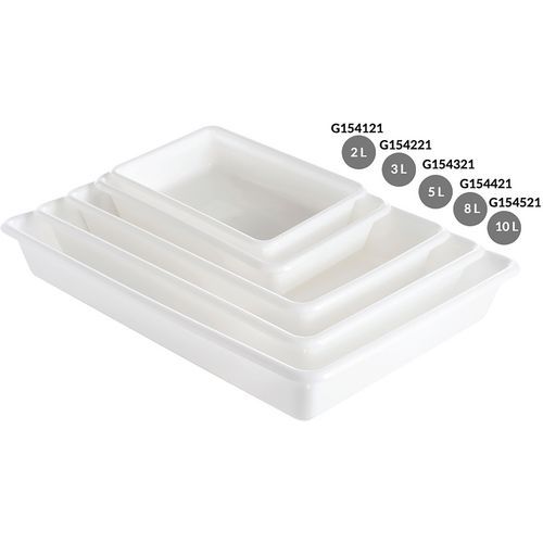 Bac plat multi-usages alimentaires : préparation, marinade, décantation, décongélation, stockage d'échantillons témoins... Spécialement étudié pour l'industrie alimentaire. Encombrement minimal par emboîtement à vide. format parfaitement adapté aux réfrigérateur.