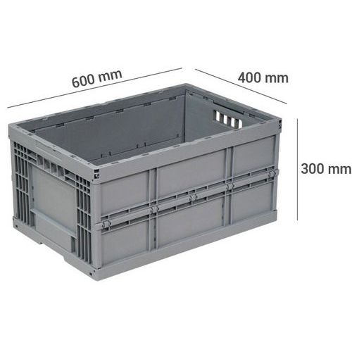 | Intitulé du produit | Bac pliant, Capacité: 58 L, Hauteur hors tout: 300 mm, Largeur hors tout: 400 mm, Longueur hors tout: 600 mm |