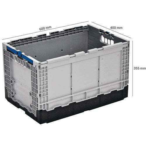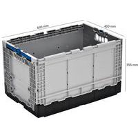 | Intitulé du produit | Bac pliant Norme Europe, Capacité: 67 L, Hauteur hors tout: 355 mm, Largeur hors tout: 400 mm |
