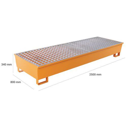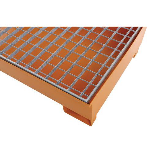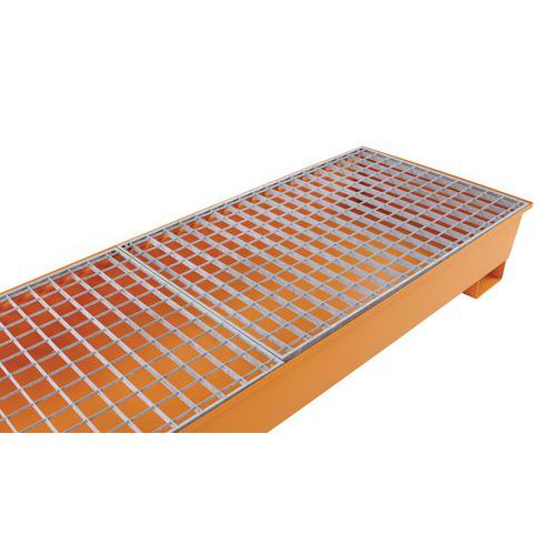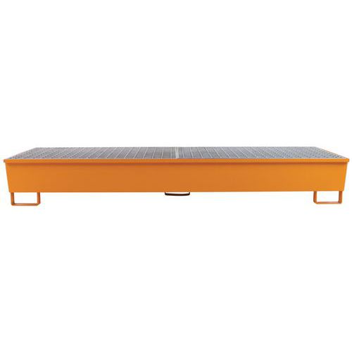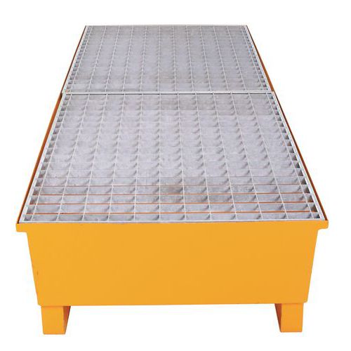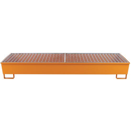 Bac de rétention avec caillebotis amovible en acier permettant une rétention de 50%. Dimension de la maille des caillebotis 70x70mm. Résistant à la charge et aux produits stockés. Idéal pour le stockage sécurisé de produits dangereux. Avec une capacité de rétention de 440 litres, ce bac de rétention est parfait pour stocker 4 fûts debout. L'extraction du liquide se fait par pompe. Pieds en U d'une hauteur de 100 mm permettant le passage facile de fourches et garantissent une stabilité optimale.