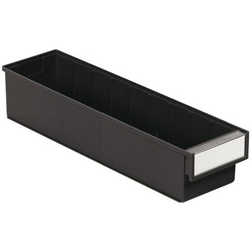 Bacs d’étagère ESD. En polypropylène (PP) semi-conducteur. L'étiquette pleine largeur avec protection se nettoie et se change facilement quand nécessaire, ces protections et étiquettes ne sont pas semi-conductrices. Fabriqué en UE