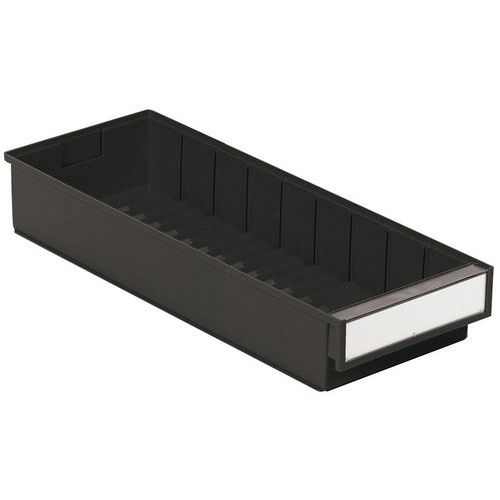 Bacs d’étagère ESD. En polypropylène (PP) semi-conducteur. L'étiquette pleine largeur avec protection se nettoie et se change facilement quand nécessaire, ces protections et étiquettes ne sont pas semi-conductrices. Fabriqué en UE