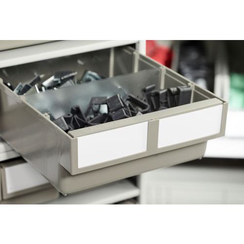 Bacs d’étagère conçus pour s'adapter à toutes les tablettes, armoires, supports rotatifs et postes de travail industriels standard. Notre gamme de produits comprend 11 bacs de différentes tailles. Disponibles dans les profondeurs suivantes : 3, 4, 5 et 6 mm. Chaque tiroir porte une étiquette et un couvercle de protection. Matériaux: PS = polystyrène transparent : température d'utilisation de -4 °C à +55 °C. PP = polypropylène coloré : température d'utilisation de -2 °C à +75 °C. Inaltérable aux huiles et à la plupart des acides et solvants. Fabriqué en UE