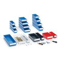 Bacs d’étagère conçus pour s'adapter à toutes les tablettes, armoires, supports rotatifs et postes de travail industriels standard. Notre gamme de produits comprend 11 bacs de différentes tailles. Disponibles dans les profondeurs suivantes : 3, 4, 5 et 6 mm. Chaque tiroir porte une étiquette et un couvercle de protection. Matériaux: PS = polystyrène transparent : température d'utilisation de -4 °C à +55 °C. PP = polypropylène coloré : température d'utilisation de -2 °C à +75 °C. Inaltérable aux huiles et à la plupart des acides et solvants.
