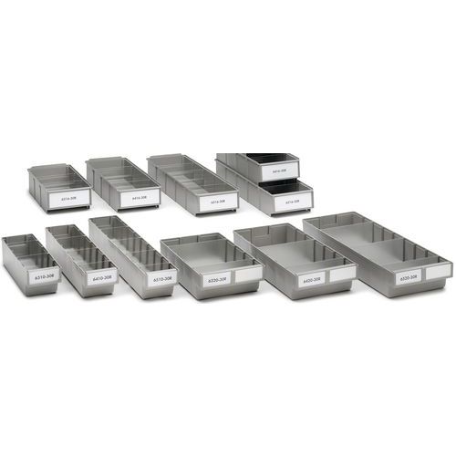 Bacs d’étagère conçus pour s'adapter à toutes les tablettes, armoires, supports rotatifs et postes de travail industriels standard. Notre gamme de produits comprend 11 bacs de différentes tailles. Disponibles dans les profondeurs suivantes : 3, 4, 5 et 6 mm. Chaque tiroir porte une étiquette et un couvercle de protection. Matériaux: PS = polystyrène transparent : température d'utilisation de -4 °C à +55 °C. PP = polypropylène coloré : température d'utilisation de -2 °C à +75 °C. Inaltérable aux huiles et à la plupart des acides et solvants. Fabriqué en UE