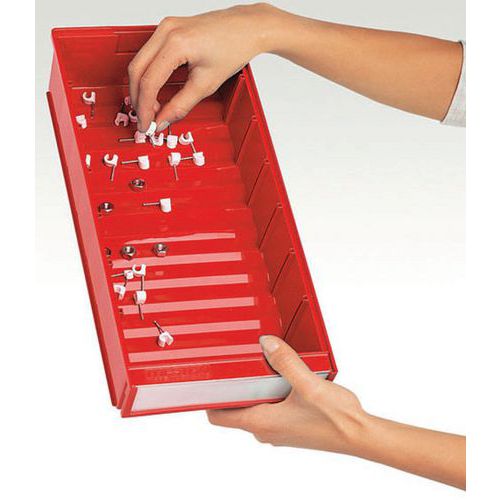 Bacs d’étagère conçus pour s'adapter à toutes les tablettes, armoires, supports rotatifs et postes de travail industriels standard. Notre gamme de produits comprend 11 bacs de différentes tailles. Disponibles dans les profondeurs suivantes : 3, 4, 5 et 6 mm. Chaque tiroir porte une étiquette et un couvercle de protection. Matériaux: PS = polystyrène transparent : température d'utilisation de -4 °C à +55 °C. PP = polypropylène coloré : température d'utilisation de -2 °C à +75 °C. Inaltérable aux huiles et à la plupart des acides et solvants.