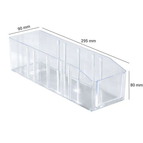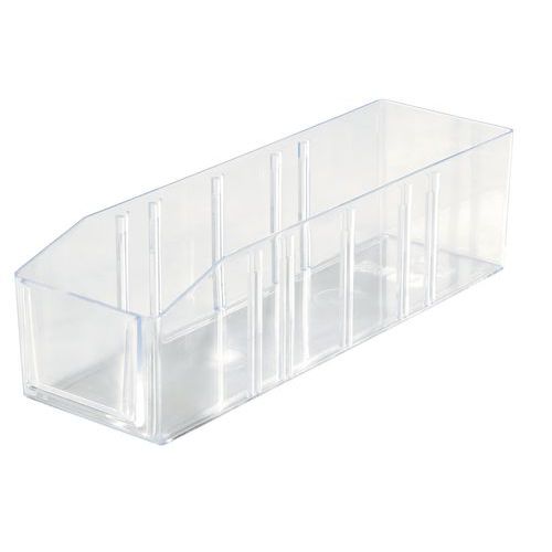 Grande robustesse. Bac-tiroir compartimentable. Bec à l'avant pour une meilleure visualisation du contenu. Parois et fond lisses. Bonne résistance aux acides.
