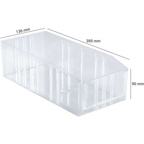Grande robustesse. Bac-tiroir compartimentable. Bec à l'avant pour une meilleure visualisation du contenu. Parois et fond lisses. Bonne résistance aux acides.