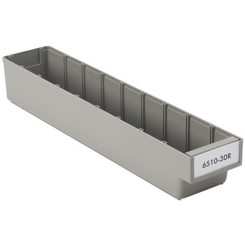 Bacs pour étagère. S’intègrent facilement dans les systèmes de rayonnages standard. Trois profondeurs : 300 mm, 400 mm et 500 mm. Existent également en version empilable. Les bacs ont des parois droites. Les étiquettes en carton sont livrées de série. Séparateurs transversaux transparents (polystyrène recyclé).