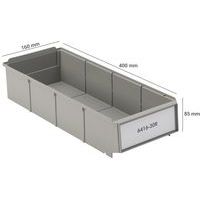 Bacs pour étagère, empilables. Les étiquettes adhésives sont livrées de série. Séparateurs transversaux transparents (polystyrène recyclé). Étiquette en carton avec protection adhésive (S16) à commander séparément, unité 20 pièce.