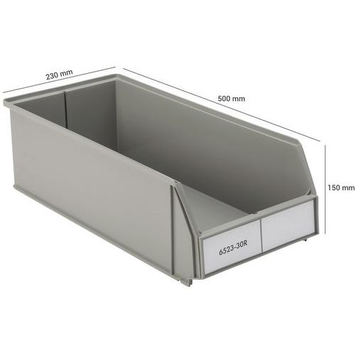 Bacs à bec, séparables longitudinalement. Largeur optimale pour les systèmes de rayonnages métriques. Les étiquettes adhésives sont livrées de série. Séparations longitudinales (polypropylène recyclé) disponibles en accessoires. Étiquette en carton avec protection adhésive (S23) à commander séparément, unité 12 pièce.