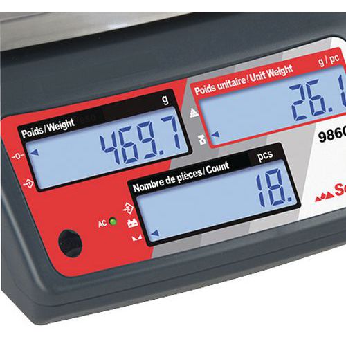 - Parfaite lisibilité grâce aux 3 afficheurs : poids brut ou net, poids unitaire et nombre de pièces.